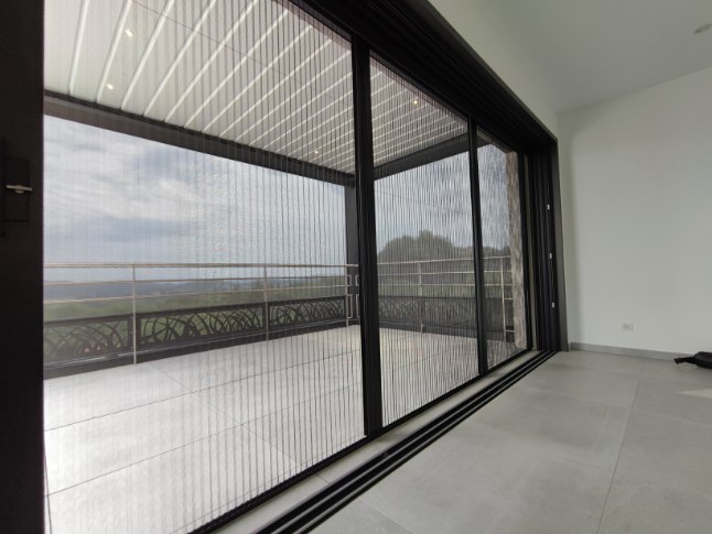 Fabrication et installation sur mesure d’un moustiquaire plissée 3 vantaux pour ouverture grande taille, permettant une ouverture totale sans encombrement une fois repliée