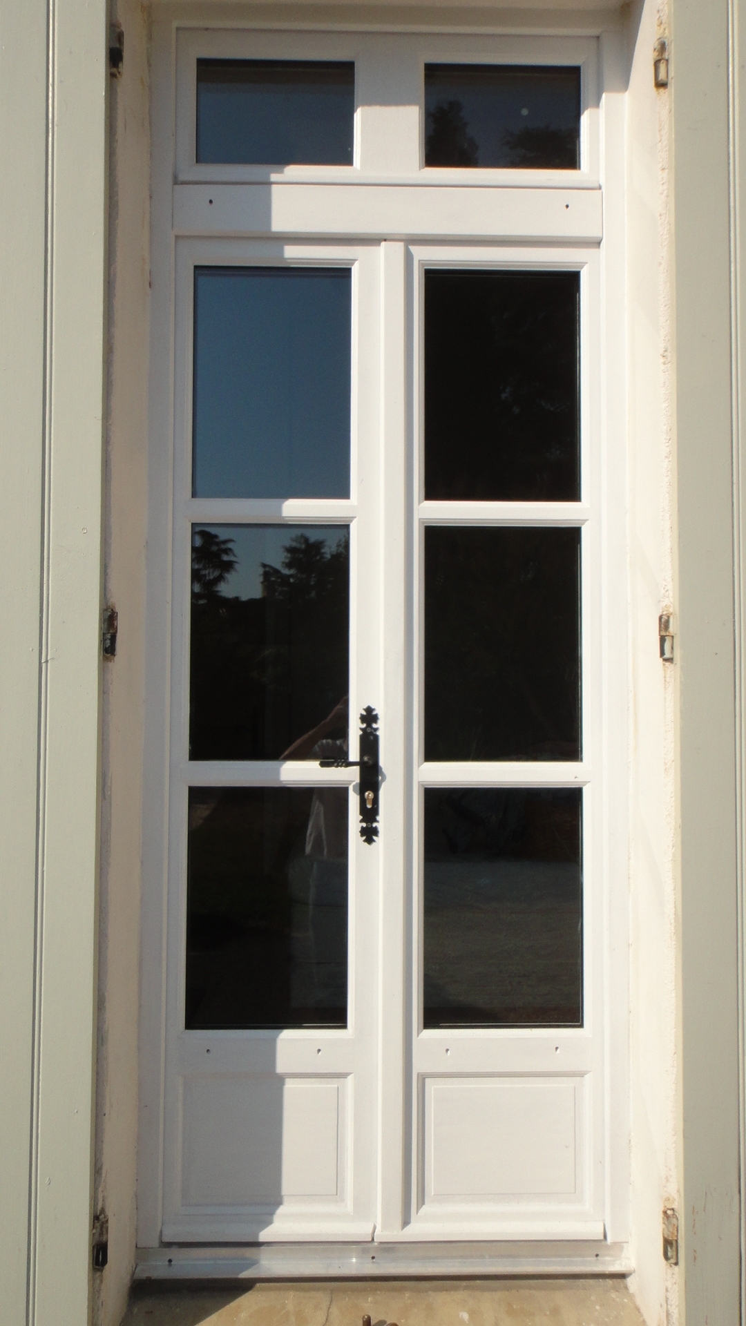 Pose en rénovation totale (avec remplacement du cadre existant) de portes fenêtres en bois exotique rouge 46 mm avec double vitrage 4/8/4 faible émissivité – Dormant Droit – Traitement par bain Hydrofuge Insecticide et Fongicide